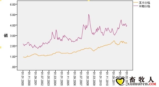 圖為2000-2013年4月玉米和豆粕價(jià)格走勢(shì)