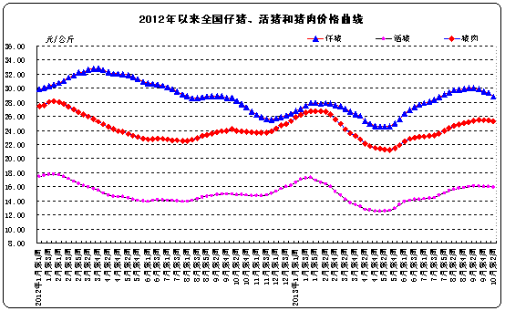 生豬價(jià)格。全國(guó)活豬平均價(jià)格15.93元/公斤,比上周下降0.4%,與去年同期相比上漲6.8%?;钬i價(jià)格上漲省份8個(gè),下降省份21個(gè),持平省份1個(gè)。西北地區(qū)活豬平均價(jià)格較高,為16.65元/公斤;華南地區(qū)較低,為15.29元/公斤。全國(guó)仔豬平均價(jià)格28.79元/公斤,比上周下降1.8%,同比上漲2.2%。仔豬價(jià)格上漲省份6個(gè),下降省份24個(gè)。全國(guó)豬肉平均價(jià)格25.30元/公斤,比上周下降0.6%,同比上漲5.5%。豬肉價(jià)格上漲省份6個(gè),下降省份22個(gè),持平省份2個(gè)。西北地區(qū)豬肉平均價(jià)格較高,為26.66元/公斤;華南地區(qū)較低,為23.65元/公斤。