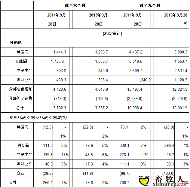生鮮豬肉 生鮮豬肉經(jīng)營(yíng)利潤(rùn)率上升至(1)%,或每頭(2)美元。季節(jié)上,第三季度是生鮮豬肉利潤(rùn)率最低的時(shí)期。但是,由于國(guó)內(nèi)蛋白產(chǎn)量下降及全球需求暢旺導(dǎo)致美國(guó)農(nóng)業(yè)部豬肉分切價(jià)格上漲19%,業(yè)績(jī)因而較去年同期改善。豬流行性腹瀉病毒(PEDv)干擾豬只生產(chǎn),本公司生豬加工量下降9%,但上市體重增加抵銷了供應(yīng)下降導(dǎo)致的這個(gè)缺口。食品服務(wù)銷量及銷售額雙雙上升。