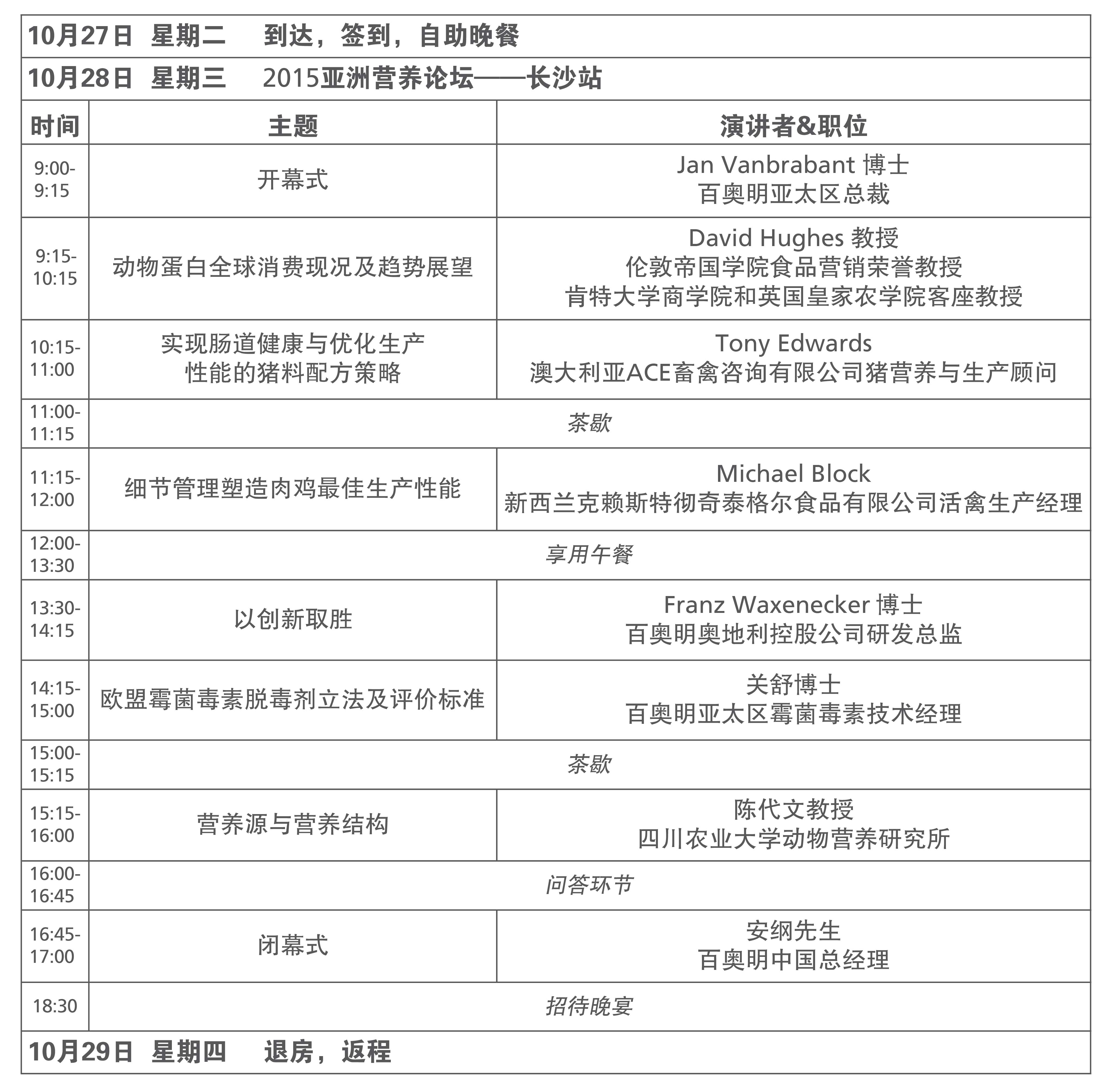 本次論壇的主題為“挑戰(zhàn)|機(jī)遇|成功”,將匯集行業(yè)頂尖專家,聚焦“如何解決全球霉菌毒素威脅”和“如何通過優(yōu)化腸道健康以提高動(dòng)物生產(chǎn)性能”等農(nóng)牧行業(yè)熱門話題。 10月28日 長(zhǎng)沙站 議程 參會(huì)方式: 請(qǐng)與百奧明當(dāng)?shù)劁N售或經(jīng)銷商聯(lián)系并憑邀請(qǐng)函出席本次大會(huì)。