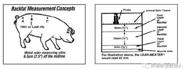 背膘測定技術(shù)作為一種母豬體況的測量方法應(yīng)用于指導(dǎo)豬的生產(chǎn),飼喂控制中, 并應(yīng)用于種豬的遺傳改良中,且扮演著測量豬活體指標(biāo)的重要有效途經(jīng)之一, 使生產(chǎn)和育種工作取得了很大進(jìn)展。本文對背膘測定在豬生產(chǎn)中的運(yùn)用原理及應(yīng)用方法作概述。 1、背膘測定技術(shù)的原理 背膘測定技術(shù)的原理是超聲儀器發(fā)射的超聲波在活體內(nèi)傳播時,遇到聲阻值不同的組織交界處時會產(chǎn)生界面反射,產(chǎn)生一個較強(qiáng)的反射波,即回聲,根據(jù)回聲的強(qiáng)弱、分布即可推斷不同組織在物體內(nèi)的位置和大小,從而測量出其長度、周長、面積等信息。由于豬的皮膚、脂肪、肌肉、骨骼、內(nèi)臟、子宮壁、胎膜等不同組織間聲阻值具有較大差異,能產(chǎn)生可識別的界面反射,因此這為背膘測定應(yīng)用于豬的活體探測提供了基礎(chǔ)。我們常用于動物活體估測的超聲波頻率在 1~5MHz 之間,尤以 3.0~3.5MHz 使用最為普遍。 背膘測量儀器主要分為A超和B超,A超是單晶體接收聲波,對機(jī)體組織進(jìn)行點(diǎn)估計,以波幅變化反映回聲情況,數(shù)碼表示。B超是多晶體接收聲波,對機(jī)體組織進(jìn)行區(qū)域性估計,以灰度實時超聲反映回聲情況,區(qū)域圖像表示。隨著技術(shù)的進(jìn)步,B 型應(yīng)用日益廣泛。豬活體各種不同組織間,由于密度、聲阻值以及所處位置的深淺不同,返回由不同灰度的像素構(gòu)成的圖像,通過對這些圖像的分析,我們便能迅速、直接的獲得豬活體的某些胴體性狀指標(biāo)和肉質(zhì)性狀的數(shù)據(jù)。此外測定設(shè)備便于攜帶、操作簡單,并具有減少對豬的應(yīng)激的特點(diǎn)。因此,背膘測定成為目前指導(dǎo)生產(chǎn)和改良豬肉品質(zhì)的主要技術(shù)之一,在提高豬的生產(chǎn)效益和評定胴體價值方面與傳統(tǒng)方法相比具有明顯的優(yōu)勢。 2、背膘測定方法步驟 2.1 清洗豬只 為了提高測量效率,我們根據(jù)豬只體表衛(wèi)生狀況,決定是否清洗豬只,一則方便操作人員測量,保護(hù)儀器。二則濕潤豬只體表皮膚,洗去體表結(jié)痂或死皮,方便儀器探測,提高測量效率。 2.2 確定測量部位 研究表明背膘測定位置有肩胛后沿處、最后肋骨處、腰薦結(jié)合處離背中線4~6厘米的地方。如圖表1與表2: 注:A3、A5、A8;B3、B5、B8;C3、C5、C8;D3、D5、D8和E3、E5、E8分別為肩部、最后肋骨處、腰薦結(jié)合處、6~7肋處和體長中點(diǎn)處距背中線3cm、5cm、8cm的背膘厚,“*”顯著性檢驗,P<0.05;“**”顯著性檢驗,P<0.01。 表2 豬活體測膘部位與胴體瘦肉率的相關(guān)系數(shù)