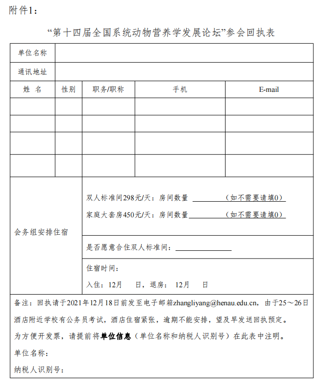 十、住宿請(qǐng) 參 會(huì) 人 員 于 2021 年 12 月 18 日 前 將 參 會(huì) 回 執(zhí) ( 附 件 1 ) 發(fā) 至 :zhangliyang@henau.edu.cn。7月份已發(fā)回執(zhí)的,如有變動(dòng)請(qǐng)告知,未發(fā)送回執(zhí) 的,請(qǐng)抓緊時(shí)間發(fā)送。由于酒店附近25~26日安排有公務(wù)員考試,住宿緊張, 請(qǐng)務(wù)必如期發(fā)送回執(zhí),否則無法保證住宿。