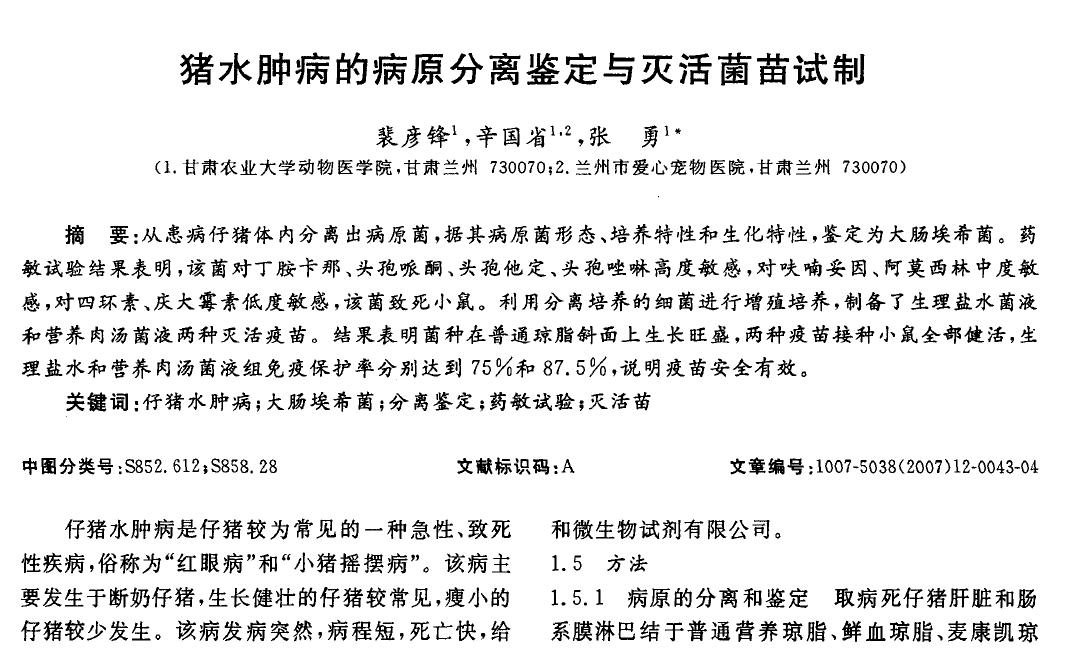豬水腫病的病原分離鑒定與滅活菌苗試制 |