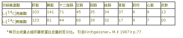 機體蛋白質是一個動態(tài)平衡體系,體蛋白質沉積是其合成和降解的結果,生長豬平均沉積1克蛋白質需要合成5-6克。生長動物蛋白質合成率大于降解率,成年動物兩個過程的速率相等,蛋白質攝入嚴重不足的動物,體蛋白質降解率則大于合成率。不同組織器官,蛋白質合成和降解的速度不一樣。用同位素標記氨基酸測得的一些組織器官蛋白質合成的速度列在表1