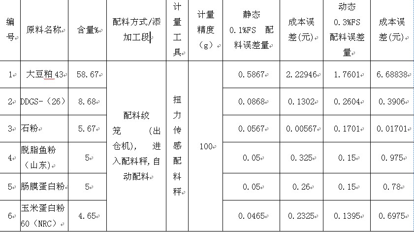 表1是一個(gè)豬濃縮飼料配方。這個(gè)配方由18種原料組成,其中大豆粕(CP43%)的含量為58.67%。在生產(chǎn)過(guò)程中,如果其配料精度是0.1%FS,那么就會(huì)造成2.22946元/t的成本誤差,這種隱性誤差基本會(huì)因?yàn)樯a(chǎn)習(xí)慣而隨著產(chǎn)量的提升成正比擴(kuò)大。在實(shí)際生產(chǎn)過(guò)程中,配料誤差要遠(yuǎn)遠(yuǎn)大于0.1%FS,尤其是對(duì)于人工配料、手動(dòng)機(jī)械配料或管理不完善的企業(yè)來(lái)說(shuō),因配料誤差不能控制在標(biāo)準(zhǔn)范圍之內(nèi)而給企業(yè)帶來(lái)的隱性成本差異是無(wú)法估量的,對(duì)于規(guī)?;暳掀髽I(yè)來(lái)說(shuō),控制配料誤差更是具有深遠(yuǎn)的意義。