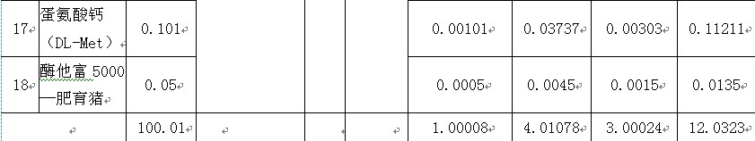 在表1的配方設(shè)計(jì)中,需要在配料秤上添加的原料品種一共有8個(gè),除大豆粕外,其他原料都會(huì)因添加量過(guò)少而達(dá)不到配料精度;而且需要人工配料與添加的原料品種達(dá)10個(gè)之多,大大影響了生產(chǎn)速度。其中,蛋氨酸鈣(DL-Met)的添加比例為0.101%。如果使用1 000kg的混合機(jī)生產(chǎn),那么其批次添加量為1.01kg,這就要求所使用的配料秤精度必須在10g以下,而且在進(jìn)入混合機(jī)之前必須經(jīng)過(guò)預(yù)混合。顯然,這樣的配方設(shè)計(jì)不僅增加了配料精度超出允許值的機(jī)率,而且降低了生產(chǎn)效率。因此,在進(jìn)行配方設(shè)計(jì)時(shí),必須要依據(jù)生產(chǎn)工藝與設(shè)備狀況來(lái)考慮各種原料的添加量是否便于生產(chǎn)的實(shí)際操作、是否符合本廠的生產(chǎn)方式。
