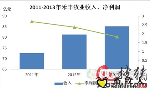 圖8-17 2011-2013年禾豐牧業(yè)收入、凈利潤(rùn) 從圖中可以看出,2011-2013年禾豐牧業(yè)的收入逐年增長(zhǎng),2013年?duì)I業(yè)收入達(dá)到85.2億,但是凈利潤(rùn)走勢(shì)相反,2013年凈利潤(rùn)為1.84億,相比2012年下降了22.6%。正是近年來(lái)凈利潤(rùn)的下降,在禾豐牧業(yè)上市前后,成為眾多機(jī)構(gòu)討論的焦點(diǎn)。2014年8月份上市之后,禾豐牧業(yè)意氣風(fēng)發(fā)正當(dāng)時(shí),大舉擴(kuò)張飼料市場(chǎng),預(yù)計(jì)2014年其收入、凈利潤(rùn)均呈增長(zhǎng)的狀態(tài)。 |