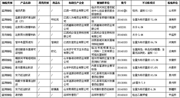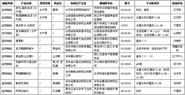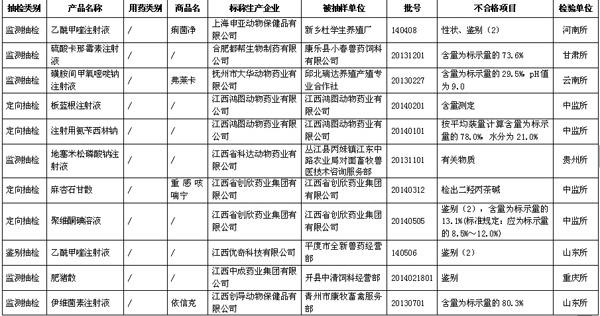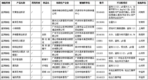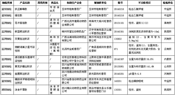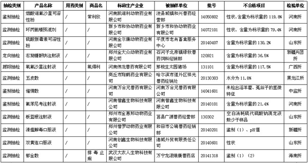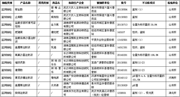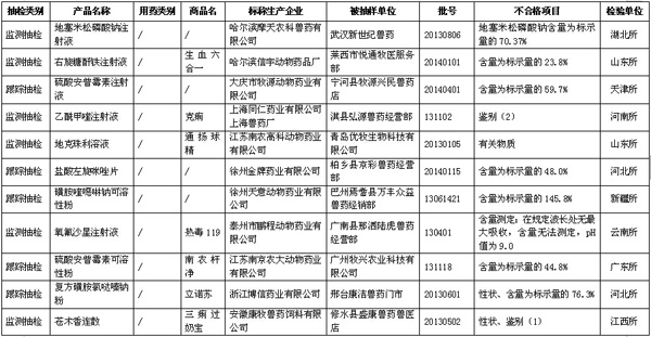 據(jù)農(nóng)業(yè)部獸醫(yī)局1月27日公布數(shù)據(jù)顯示,2014年第三季度全國(guó)共抽檢出不合格獸藥201批,不合格生物制品3批。詳見(jiàn)表格(為便于觀察,刪除了序號(hào)等表格項(xiàng)目)。 農(nóng)業(yè)部關(guān)于2014年第四期獸藥質(zhì)量監(jiān)督抽檢的通報(bào) 按照我部統(tǒng)一部署,全國(guó)31個(gè)省級(jí)獸藥監(jiān)察所和中國(guó)獸醫(yī)藥品監(jiān)察所組織完成了2014年第三季度獸藥質(zhì)量監(jiān)督抽檢計(jì)劃?,F(xiàn)將抽檢情況通報(bào)如下。 一、基本情況 2014年第三季度共完成獸藥(不包括獸用生物制品)監(jiān)督抽檢3984批,合格3783批,不合格201批(附件1、附件2),合格率為95.0%,比2014年第二季度(95.6%)下降0.6個(gè)百分點(diǎn),比2013年同期(93.6%)提高1.4個(gè)百分點(diǎn)。其中,獸藥監(jiān)測(cè)抽檢共抽檢2828批,合格2695批,合格率為95.3%;獸藥跟蹤抽檢共抽檢605批,合格585批,合格率為96.7%;獸藥定向抽檢共抽檢135批,合格121批,合格率為89.6%;獸藥鑒別抽檢共抽檢416批,合格382批,合格率為91.8%。 從抽檢環(huán)節(jié)看,生產(chǎn)環(huán)節(jié)抽檢597批,合格572批,合格率為95.8%,比2014年第二季度(97.6%)下降1.8個(gè)百分點(diǎn);經(jīng)營(yíng)環(huán)節(jié)抽檢2736批,合格2589批,合格率為94.6%,比2014年第二季度(95.1%)下降0.5個(gè)百分點(diǎn);使用環(huán)節(jié)抽檢651批,合格622批,合格率為95.5%,比2014年第二季度(95.6%)下降0.1個(gè)百分點(diǎn)。 從產(chǎn)品類別看,化藥類產(chǎn)品共抽檢1952批,合格1881批,合格率為96.4%,比2014年第二季度(96.1%)提高0.3個(gè)百分點(diǎn);抗生素類產(chǎn)品共抽檢1128批,合格1085批,合格率為96.2%,比2014年第二季度(97.2%)下降1.0個(gè)百分點(diǎn);中藥類產(chǎn)品共抽檢879批,合格792批,合格率為90.1%,比2014年第二季度(92.5%)下降2.4個(gè)百分點(diǎn);其他類產(chǎn)品共抽檢25批,合格25批,合格率為100%。 2014年第三季度共完成獸用生物制品監(jiān)督抽檢125批,合格122批,不合格3批(附件3),合格率97.6%。 關(guān)于2014年第三季度獸藥抽檢合格產(chǎn)品相關(guān)信息,請(qǐng)登陸“中國(guó)獸藥信息網(wǎng)”的“國(guó)家獸藥基礎(chǔ)信息查詢系統(tǒng)”查閱。 二、重點(diǎn)監(jiān)控企業(yè) 根據(jù)重點(diǎn)監(jiān)控企業(yè)劃分原則,判定以下7家企業(yè)為重點(diǎn)監(jiān)控企業(yè):1.山西華興動(dòng)物藥業(yè)有限公司(全年獸藥質(zhì)量通報(bào)產(chǎn)品含量低于20% 2批次以上的,2014年第三季度2批次);2.合肥都幫生物制藥有限公司(全年獸藥質(zhì)量通報(bào)產(chǎn)品含量低于20% 2批次以上的,2014年第二季度、第三季度各1批次);3.山東誼源動(dòng)物藥業(yè)有限公司(每期獸藥質(zhì)量通報(bào)中同一企業(yè)被抽檢產(chǎn)品少于50批且不合格產(chǎn)品累計(jì)5批次以上的);4.武漢大農(nóng)人生物科技有限公司(每期獸藥質(zhì)量通報(bào)中同一企業(yè)被抽檢產(chǎn)品少于50批且不合格產(chǎn)品累計(jì)5批次以上的);5.玉林市桂南獸藥廠(每期獸藥質(zhì)量通報(bào)中屬于改變組方違法添加其他獸藥成分2批次以上,2014年第三季度4批);6.西安樂(lè)道生物科技有限公司(每期獸藥質(zhì)量通報(bào)中屬于改變組方違法添加其他獸藥成分2批次以上,2014年第三季度3批)。 三、存在的主要問(wèn)題 從第三季度抽檢情況看,鑒別和含量不合格仍然是獸藥質(zhì)量檢驗(yàn)不合格的主要項(xiàng)目,部分產(chǎn)品含量較低甚至為0,個(gè)別產(chǎn)品含量無(wú)法測(cè)定、改變組方違法添加其他獸藥成分。 四、工作要求 (一)依法從重處罰違法行為 各地要按照農(nóng)業(yè)部公告2071號(hào)規(guī)定,對(duì)2014年3月3日后生產(chǎn)、符合從重處罰的,依法予以從重處罰,并及時(shí)將有關(guān)材料報(bào)我部獸醫(yī)局,啟動(dòng)吊銷獸藥產(chǎn)品批準(zhǔn)文號(hào)及獸藥生產(chǎn)許可證程序。對(duì)鑒別檢驗(yàn)不合格的,各檢驗(yàn)機(jī)構(gòu)要進(jìn)一步開(kāi)展檢驗(yàn),確定其是否存在改變制劑組方、非法添加其他藥物成分等違法行為,為處罰提供技術(shù)支持。 (二)組織開(kāi)展查處活動(dòng) 各地要集中力量對(duì)被通報(bào)的假劣獸藥組織開(kāi)展查處活動(dòng),對(duì)相關(guān)違法企業(yè)實(shí)施飛行檢查,責(zé)令生產(chǎn)企業(yè)召回銷毀假劣獸藥,對(duì)違法行為依法組織查處。其中,對(duì)鑒別、含量不合格的產(chǎn)品,責(zé)令企業(yè)對(duì)不合格產(chǎn)品停產(chǎn)整改,查找原因,保證產(chǎn)品質(zhì)量,經(jīng)企業(yè)所在地省級(jí)獸醫(yī)管理部門審核整改合格后,方可恢復(fù)生產(chǎn)。各省級(jí)獸醫(yī)管理部門及時(shí)將查處結(jié)果及企業(yè)整改結(jié)果報(bào)我部獸醫(yī)局。 (三)加強(qiáng)獸藥質(zhì)量信息通報(bào) 各地要及時(shí)將抽檢結(jié)果信息通報(bào)轄區(qū)內(nèi)有關(guān)單位,防止養(yǎng)殖者誤用假劣獸藥,提高養(yǎng)殖安全用藥水平。 (四)繼續(xù)強(qiáng)化獸藥企業(yè)日常監(jiān)管 各地要加強(qiáng)本轄區(qū)獸藥生產(chǎn)企業(yè)的獸藥GMP后續(xù)監(jiān)管,對(duì)違反獸藥GMP規(guī)定的,責(zé)令其限期整改。要進(jìn)一步加強(qiáng)獸藥經(jīng)營(yíng)企業(yè)的獸藥GSP后續(xù)監(jiān)管,強(qiáng)化獸藥采購(gòu)源頭