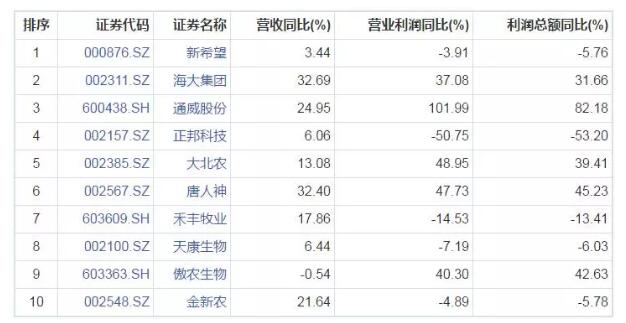 中國(guó)A股飼料行業(yè)2017年三季報(bào)披露公司共15家,實(shí)現(xiàn)盈利14家,虧損1家。雖然第四季度的業(yè)績(jī)還沒出來(lái),但是飼料企業(yè)經(jīng)過飼料原料和環(huán)保因素導(dǎo)致第四季度的業(yè)績(jī)要好于前三季度。可以說(shuō),2017年是一個(gè)飼料年。 三個(gè)季度飼料上市企業(yè)總營(yíng)業(yè)收入1553.55億,總營(yíng)業(yè)利潤(rùn)90.82億,行業(yè)營(yíng)業(yè)利潤(rùn)/營(yíng)業(yè)總營(yíng)收=5.85%,其中營(yíng)業(yè)收入前五位分別為新希望458.63億、海大集團(tuán)265.02億、通威股份196.13億、正邦科技147.29億、大北農(nóng)133.85億, 營(yíng)業(yè)利潤(rùn)前五位分別為新希望27.10億、通威股份19.55億、海大集團(tuán) 14.15億、大北農(nóng)10.35億、正邦科技 4.39億。(作為“中國(guó)豬飼料第一品牌”2017年雙胞胎豬飼料銷量突破900萬(wàn)噸,是行業(yè)最值得關(guān)注的。) 行業(yè)總營(yíng)業(yè)收入同比增長(zhǎng)14.48%,總營(yíng)業(yè)利潤(rùn)同比增長(zhǎng)12.83%。營(yíng)業(yè)收入前5位企業(yè)占行業(yè)總營(yíng)收77.30%,營(yíng)業(yè)利潤(rùn)前5位企業(yè)占行業(yè)總利潤(rùn)83.16%,虧損企業(yè)主要有康達(dá)爾。 2017年三季報(bào)A股飼料行業(yè)按營(yíng)業(yè)收入排行前10位如下 飼料行業(yè)營(yíng)業(yè)收入排行前10位企業(yè)同比增長(zhǎng)情況如下 2017年三季報(bào)飼料行業(yè)虧損企業(yè)名單如下 來(lái)源:《國(guó)際家禽》、前瞻網(wǎng) |
