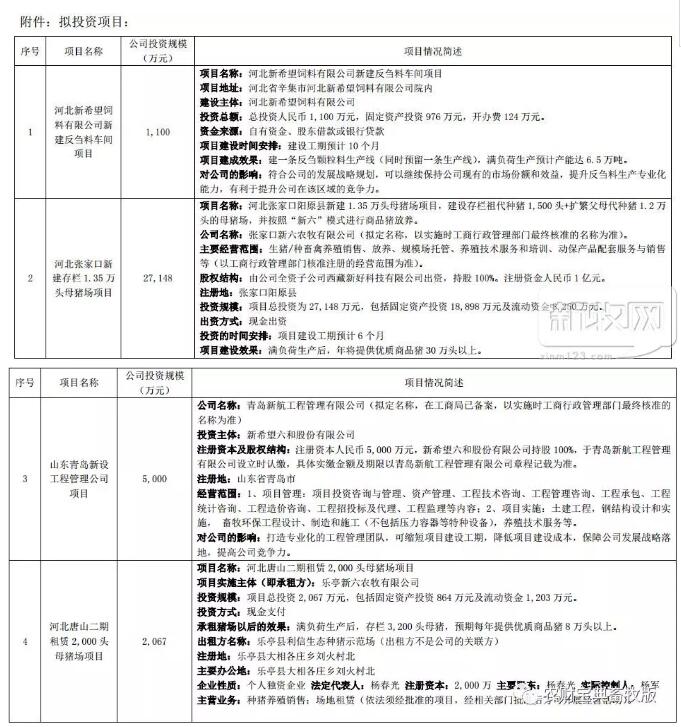 近日,新希望六和股份有限公司發(fā)布公告,公司通過(guò)了河北張家口新建存欄 1.35 萬(wàn)頭母豬場(chǎng)等四個(gè)項(xiàng)目,總投資約3.5億元,布局豬場(chǎng)、飼料等市場(chǎng)。其中2.9億元用于建設(shè)豬場(chǎng),建成后可年提供斷奶仔豬38萬(wàn)頭以上。 新希望投3.5億元再布局飼料、養(yǎng)豬! 巨潮資訊 據(jù)巨潮資訊稱,新希望六和股份有限公司(以下簡(jiǎn)稱“公司”)第七屆董事會(huì)第二十四次會(huì)議于 2018 年 2 月 13 日以通訊表決方式召開(kāi)。審議并通過(guò)了如下議案: ?。ㄒ唬徸h并通過(guò)了“關(guān)于河北新希望飼料有限公司新建反芻料車(chē)間項(xiàng)目的議案” 為了促進(jìn)公司的反芻飼料加工、養(yǎng)殖業(yè)務(wù)的發(fā)展,優(yōu)化飼料業(yè)務(wù)產(chǎn)品結(jié)構(gòu),提升專(zhuān)業(yè)化生產(chǎn)能力,經(jīng)調(diào)研論證,擬在河北新希望飼料有限公司新建反芻料車(chē)間,項(xiàng)目投資總額擬為 1,100 萬(wàn)元( 具體情況詳見(jiàn)附件)。 ?。ǘ徸h并通過(guò)了“關(guān)于河北張家口新建存欄 1.35 萬(wàn)頭母豬場(chǎng)項(xiàng)目的議案” 為了充分發(fā)揮環(huán)渤海區(qū)綜合優(yōu)勢(shì),根據(jù)公司生豬產(chǎn)業(yè)發(fā)展戰(zhàn)略,公司擬在河北省張家口市新建存欄祖代種豬 1,500 頭+擴(kuò)繁父母代種豬 1.2 萬(wàn)頭的母豬場(chǎng)。項(xiàng)目滿負(fù)荷生產(chǎn)后,年可提供斷奶仔豬 30 萬(wàn)頭以上。本項(xiàng)目占地為 1,200 畝,總投資 27,148 萬(wàn)元,包括固定資產(chǎn)投資 18,898 萬(wàn)元及流動(dòng)資金 8,250 萬(wàn)元( 具體情況詳見(jiàn)附件)。 ?。ㄈ徸h并通過(guò)了“關(guān)于山東青島新設(shè)工程管理公司項(xiàng)目的議案” 為實(shí)施好公司發(fā)展戰(zhàn)略,在提升公司競(jìng)爭(zhēng)力的同時(shí)抓住近年來(lái)農(nóng)業(yè)生產(chǎn)供給側(cè)結(jié)構(gòu)性改革的機(jī)遇,特別是規(guī)模化、現(xiàn)代化養(yǎng)殖大發(fā)展中的農(nóng)機(jī)設(shè)備、養(yǎng)殖設(shè)施、食品加工裝備技術(shù)升級(jí)的市場(chǎng)機(jī)會(huì), 以及支持公司各方面投資項(xiàng)目建設(shè),公司準(zhǔn)備打造專(zhuān)業(yè)化的工程建設(shè)團(tuán)隊(duì),在山東省青島市注冊(cè)成立一家工程管理公司,注冊(cè)資金 5,000 萬(wàn)元(具體情況詳見(jiàn)附件)。 (四)審議并通過(guò)了“關(guān)于河北唐山二期租賃 2,000 頭母豬場(chǎng)項(xiàng)目的議案” 按照公司生豬產(chǎn)業(yè)發(fā)展規(guī)劃,公司擬在河北省唐山市樂(lè)亭縣原租賃豬場(chǎng)項(xiàng)目中(一期項(xiàng)目已于 2016 年 6 月 29 日經(jīng)公司第七屆董事會(huì)第三次會(huì)議審議通過(guò),項(xiàng)目投資金額為 1,000 萬(wàn)元,一期租賃豬場(chǎng)容納父母代 1,200 頭)擴(kuò)大租賃父母代種豬 2,000 頭。項(xiàng)目滿負(fù)荷生產(chǎn)后,年可提供斷奶仔豬 8 萬(wàn)頭以上。本項(xiàng)目占地 160 畝,總投資擬為2,067 萬(wàn)元,包括固定資產(chǎn)投資 864 萬(wàn)元及流動(dòng)資金 1,203 萬(wàn)元( 具體情況詳見(jiàn)附件)。 |