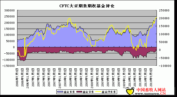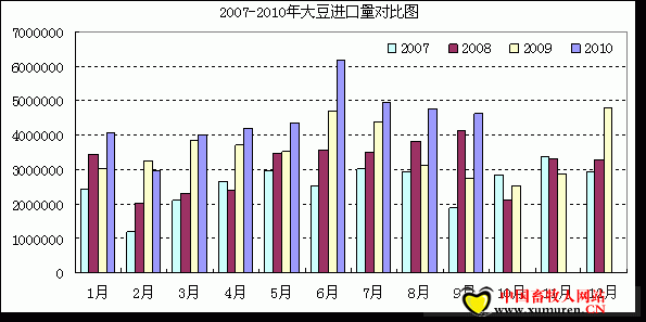 因此,在諸多因素共同推動(dòng)下,多方力量將不斷壯大,從而促進(jìn)大豆價(jià)格上漲。 4、“中國(guó)需求”與其他主要糧食產(chǎn)品將主導(dǎo)大豆后期多頭行情 據(jù)國(guó)家糧油中心的信息稱,迄今為止,中國(guó)今年對(duì)美豆的采購(gòu)量增長(zhǎng)了14%,而對(duì)比近幾年來(lái)大豆的進(jìn)口量,今年明顯超過(guò)過(guò)去幾年,單月來(lái)看,目前2010年的最大進(jìn)口量幾乎為08年金融危機(jī)之前水平的二倍,根據(jù)季節(jié)性特征,四季度進(jìn)口量將重新開(kāi)始逐步上升,從而繼續(xù)推高國(guó)際大豆的價(jià)格。而美國(guó)農(nóng)業(yè)部連續(xù)下調(diào)美豆產(chǎn)量與庫(kù)存的消息,也印證了前期市場(chǎng)不斷炒作的“中國(guó)需求”。