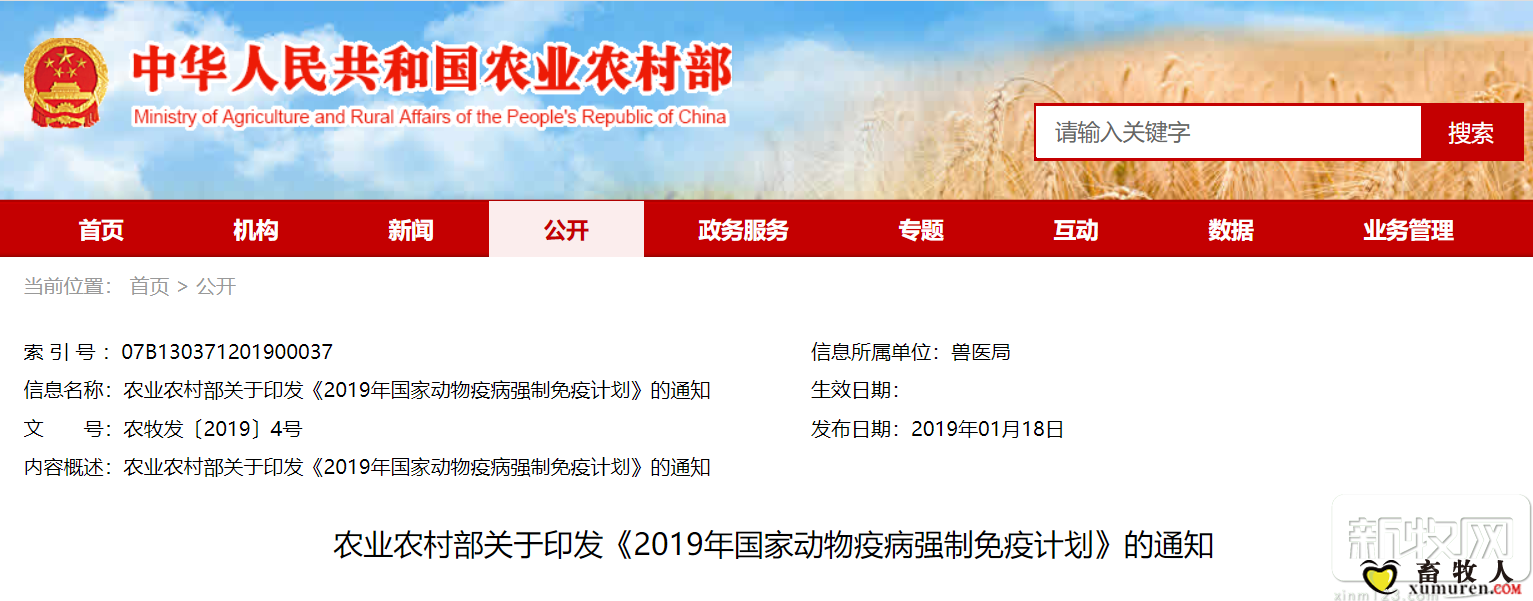 正文摘要:農(nóng)業(yè)農(nóng)村部關(guān)于印發(fā)《2019年國(guó)家動(dòng)物疫病強(qiáng)制免疫計(jì)劃》的通知 各省、自治區(qū)、直轄市及計(jì)劃單列市畜牧獸醫(yī)(農(nóng)業(yè)農(nóng)村、農(nóng)牧)廳(局、委、辦),新疆生產(chǎn)建設(shè)兵團(tuán)畜牧獸醫(yī)局,部屬有關(guān)事業(yè)單位: 為認(rèn)真貫徹 ... |