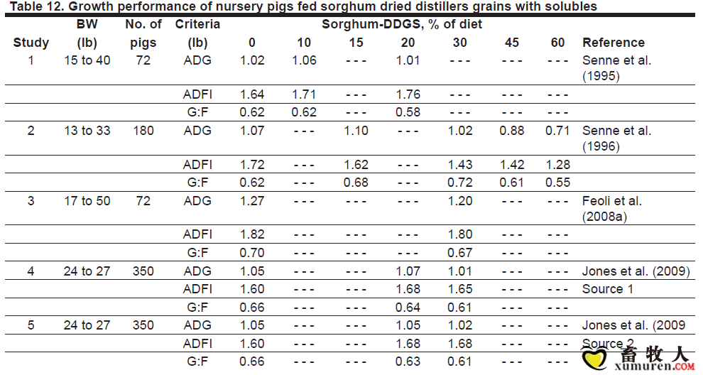 正文摘要:保育豬 總共有5個(gè)試驗(yàn)評(píng)估了保育豬日糧中添加高粱DDGS的影響(表12)??傮w來(lái)講,添加30%的高粱DDGS對(duì)保育豬的ADG、ADFI、G:F均無(wú)負(fù)面影響。一個(gè)試驗(yàn)發(fā)現(xiàn)添加0%、15%、30%、45%、60%的高粱DDGS,保育豬的AD ... |