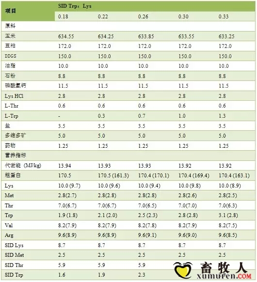 正文摘要:1 前言NRC(2012)對(duì)初產(chǎn)和經(jīng)產(chǎn)母豬標(biāo)準(zhǔn)回腸可消化(SID)Trp和賴氨酸(Lys)的比值分別為0.14~0.17和0.13-0.16。然而,近期研究發(fā)現(xiàn)飼糧表觀回腸可消化(AID)Lys水平為0.85%時(shí),哺乳母豬獲得最佳性能的AIDTrp為0 ... |