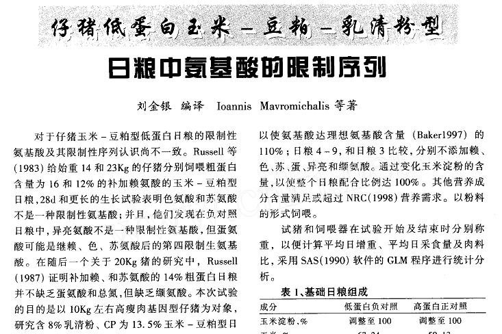 仔豬低蛋白玉米-豆粕-乳清粉型日糧中氨基酸的限制序列 |
