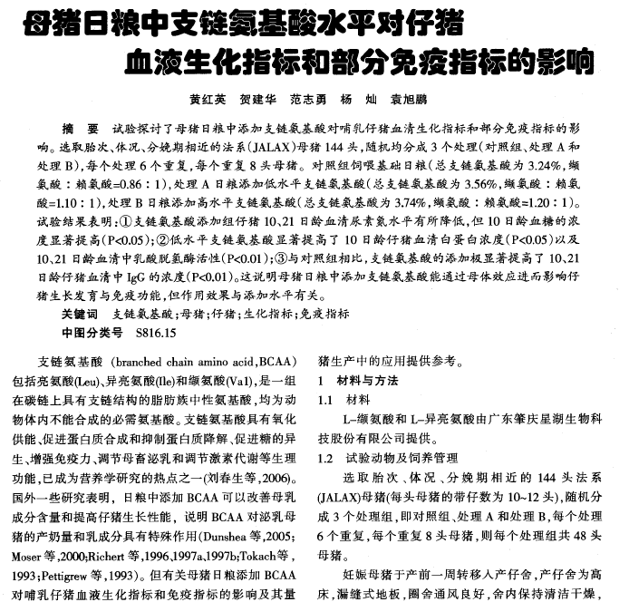 母豬日糧中支鏈氨基酸水平對仔豬血液生化指標和部分免疫指標的影響 |