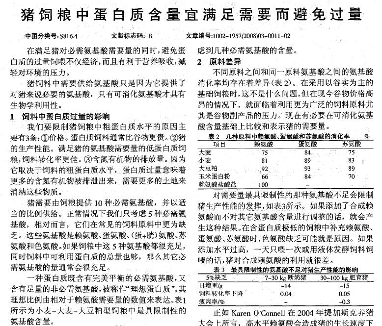豬飼糧中蛋白質含量宜滿足需要而避免過量 |