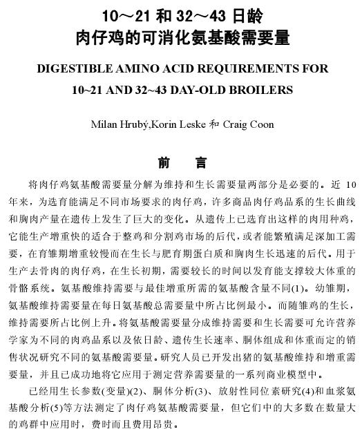 10~21 和32~43 日齡肉仔雞的可消化氨基酸需要量 |