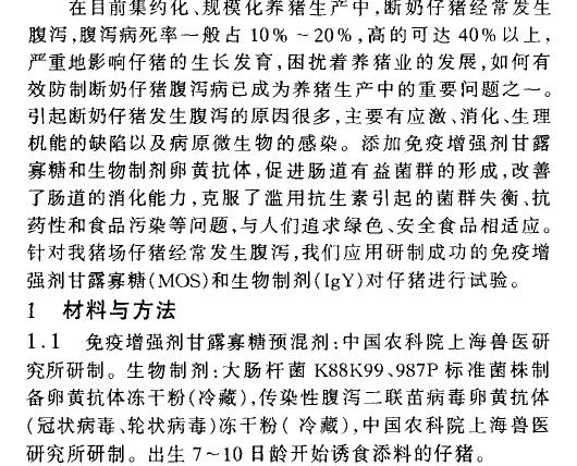 免疫增強(qiáng)劑甘露寡糖和生物制劑預(yù)防早期斷奶仔豬腹瀉的試驗 |