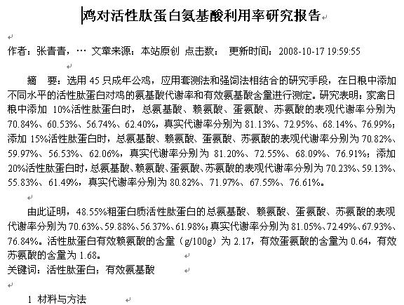 雞對活性肽蛋白氨基酸利用率研究報告 |