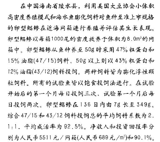 在中國海南利用近海網(wǎng)箱和膨化飼料養(yǎng)殖卵型鯧鲹的生長表現(xiàn) |