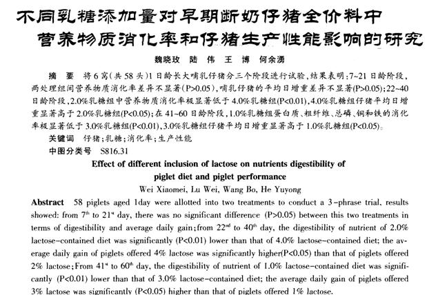 不同乳糠添加量對早期斷奶仔豬全價料中營養(yǎng)物質消化率和仔豬性能影響的研究 |
