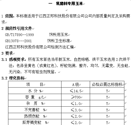 正邦乳豬飼料原料標準 |