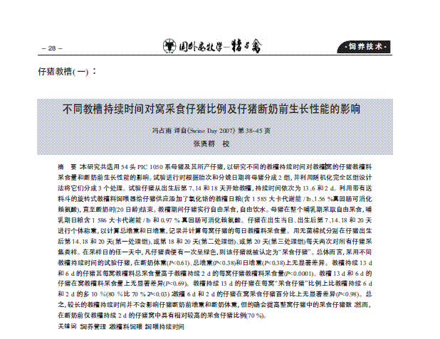 仔豬教槽_一_不同教槽持續(xù)時間對窩采食仔豬比例及仔豬斷奶前生長性能的影響 |