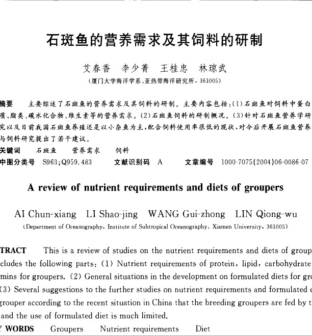 石斑魚的營養(yǎng)需求及其飼料的研制 |