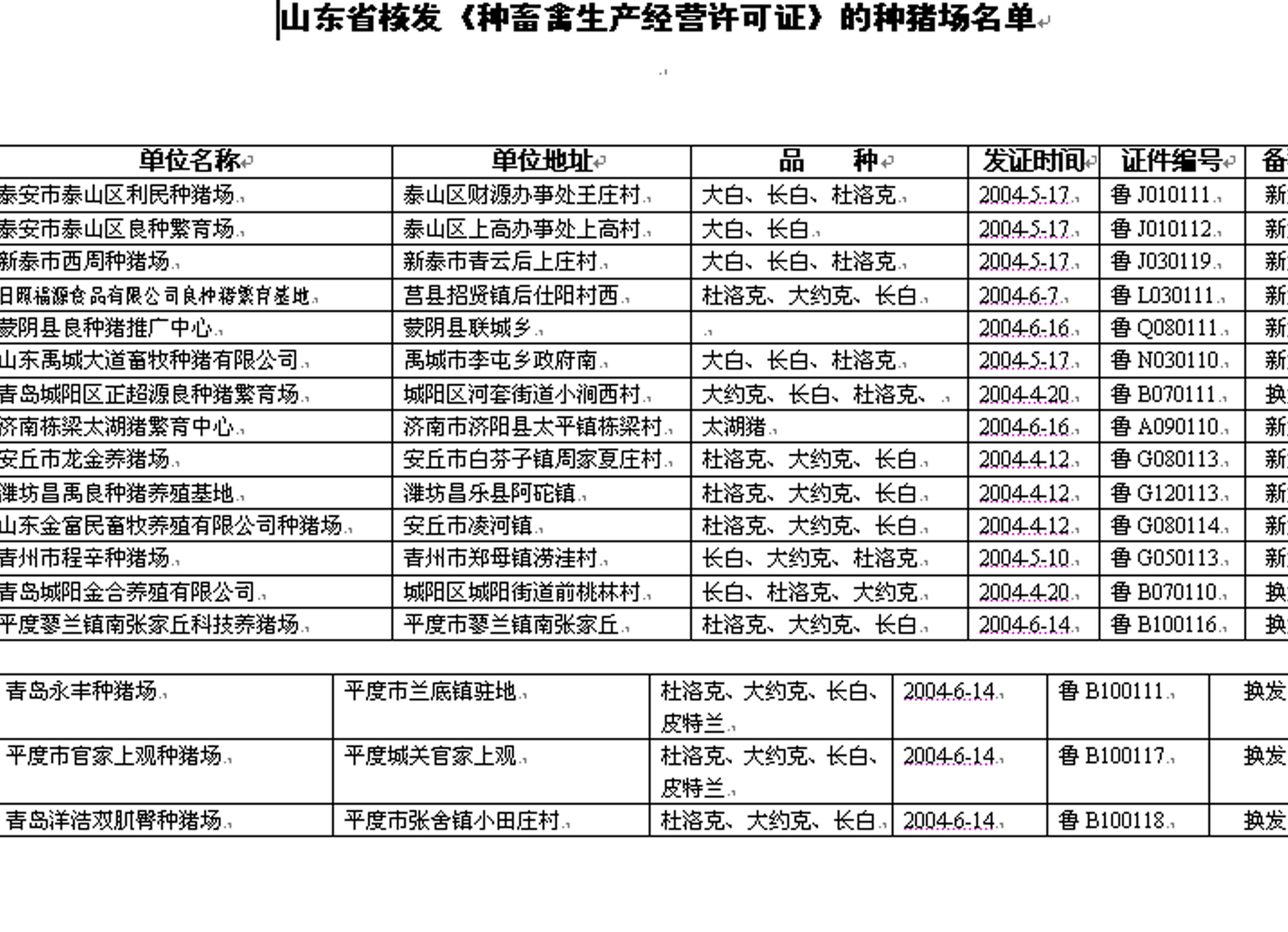 山東省核發(fā)《種畜禽生產(chǎn)經(jīng)營許可證》的種豬場名單 |